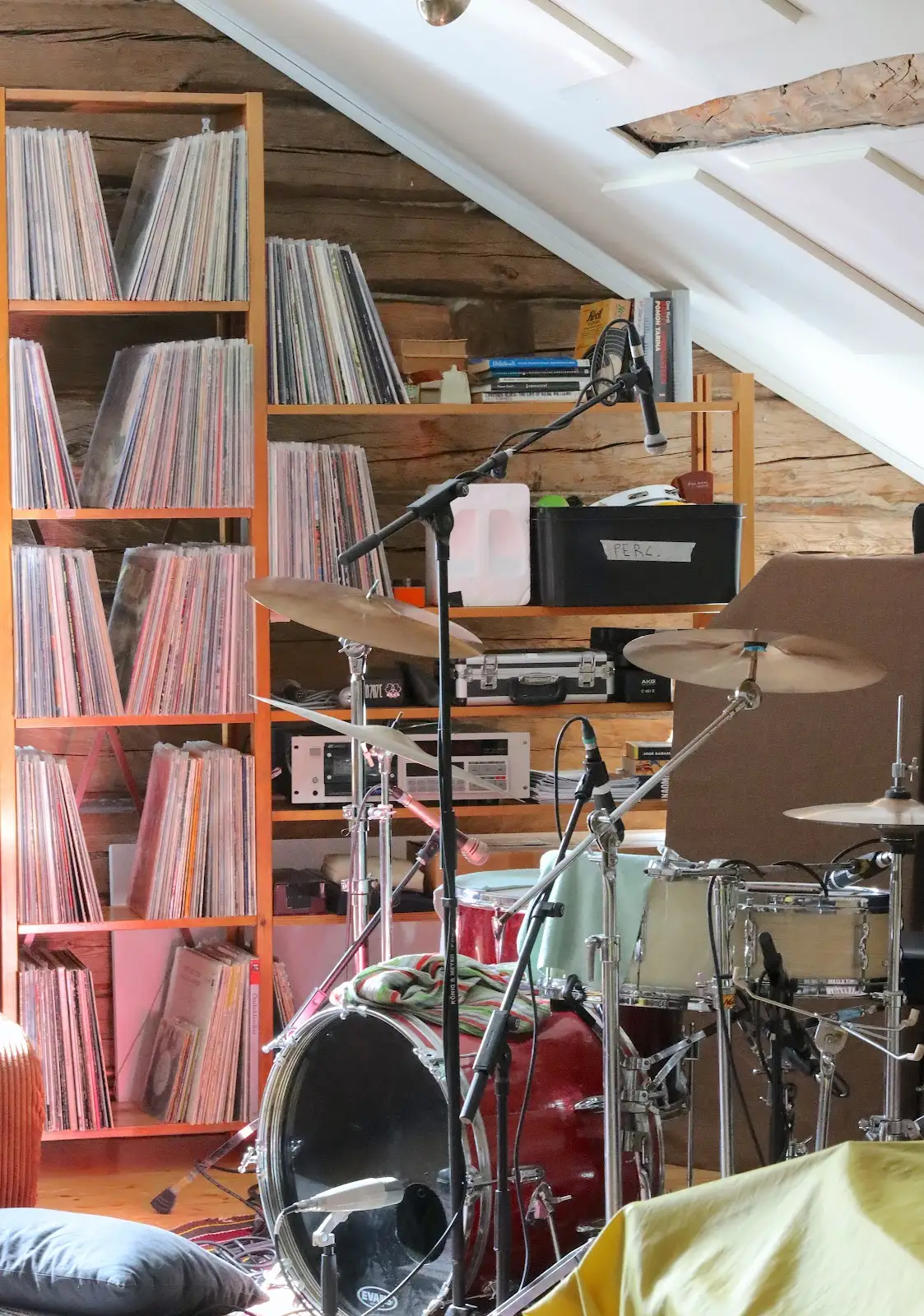 Kairanmaa Residency offers a range of equipment for music and sound production, including drums, keyboards, guitars, amplifiers, percussion, and studio-grade monitors (Genelec).